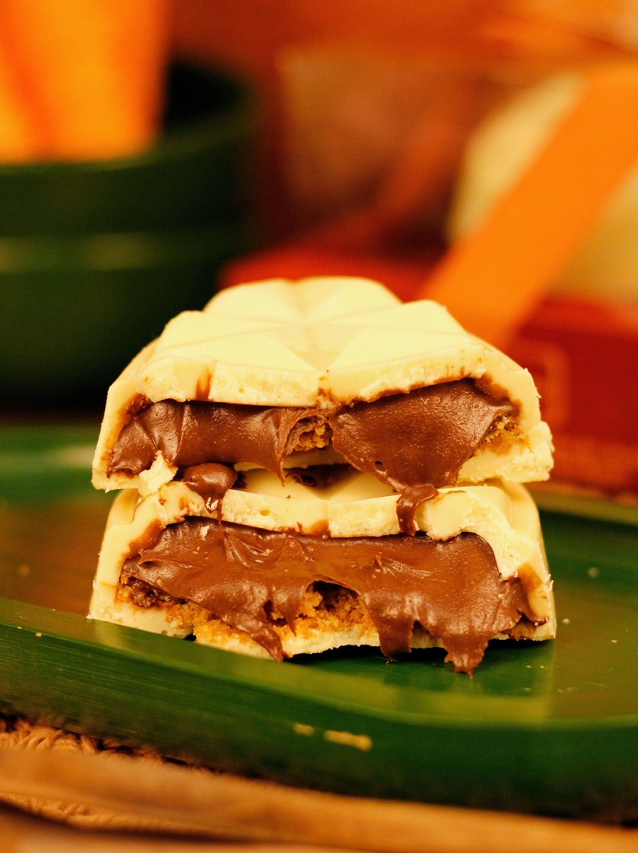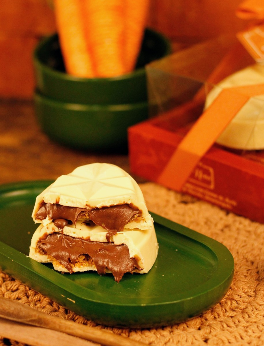 Chocolate branco Nobre com recheio de Creme de Avelã.